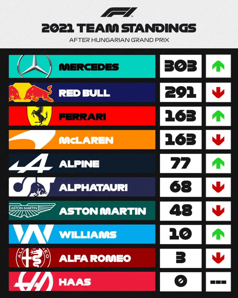 Sementara itu Esteban Ocon yang berhasil keluar sebagai pemenang balapan naik ke posisi 11 dengan 39 poin. Pada kejuaraan konstruktor, Mercedes juga berhasil menyalip Red Bull dan kini unggul 10 poin. Namun, beberapa jam setelah balap F1 Hongaria 2021 selesai, FIA mengumumkan bahwa pembalap Tim Aston Martin, Sebastian Vettel didiskualifiasi dari posisi podium kedua karena tidak bisa memenuhi regulasi jumlah sisa bahan bakar untuk diperiksa oleh FIA.